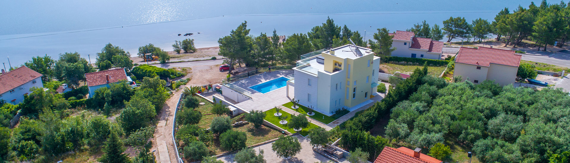 Von der Terrasse, die sich über dem Pool erstreckt, bietet sich ein einzigartiger Blick auf das Meer, den Strand und Velebit.